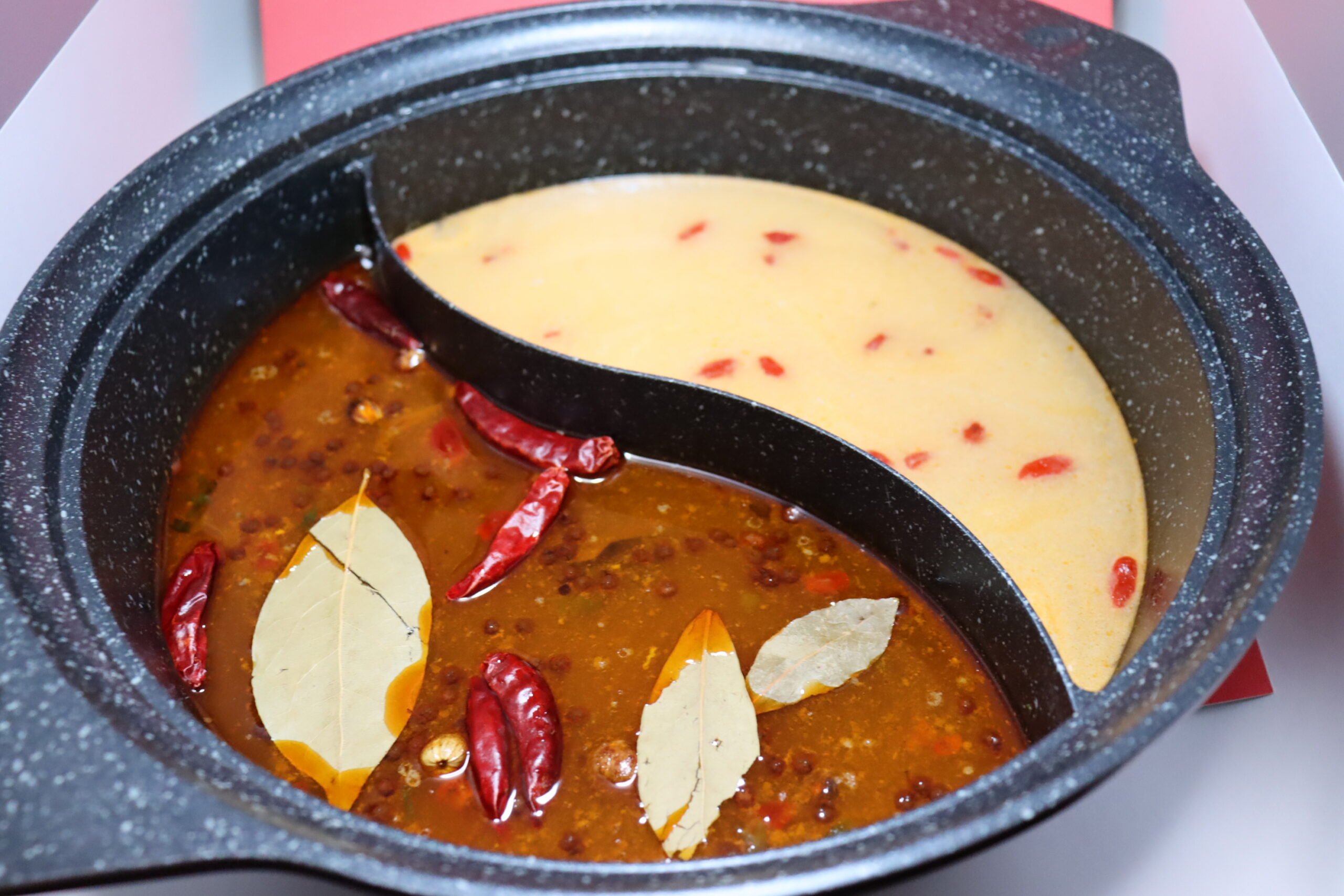 火鍋の素と白湯の素を1200mlのお湯に入れる。(2分割火鍋の場合は別々に)
